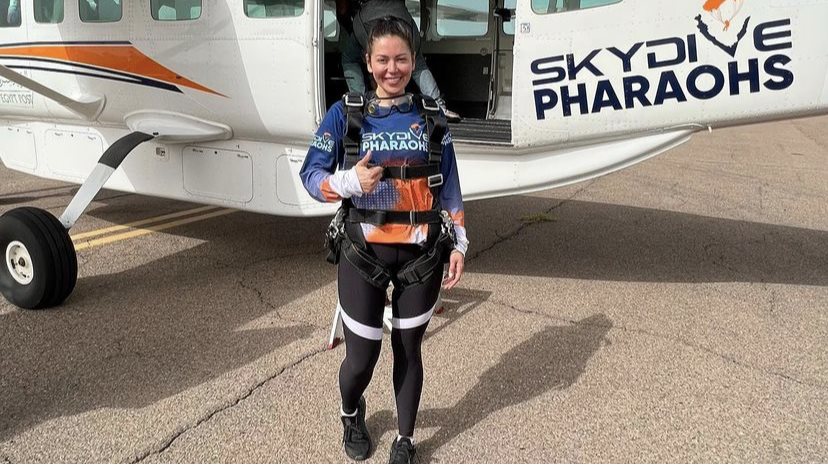 وظهرت لقاء الخميسي في الصورة بإطلالة صيفية أنيقة، مرتدية جيبة باللون الأبيض، مع بلوزة باللونين الأبيض والبرتقالي، رافعة خصلات شعرها الي أعلي.
