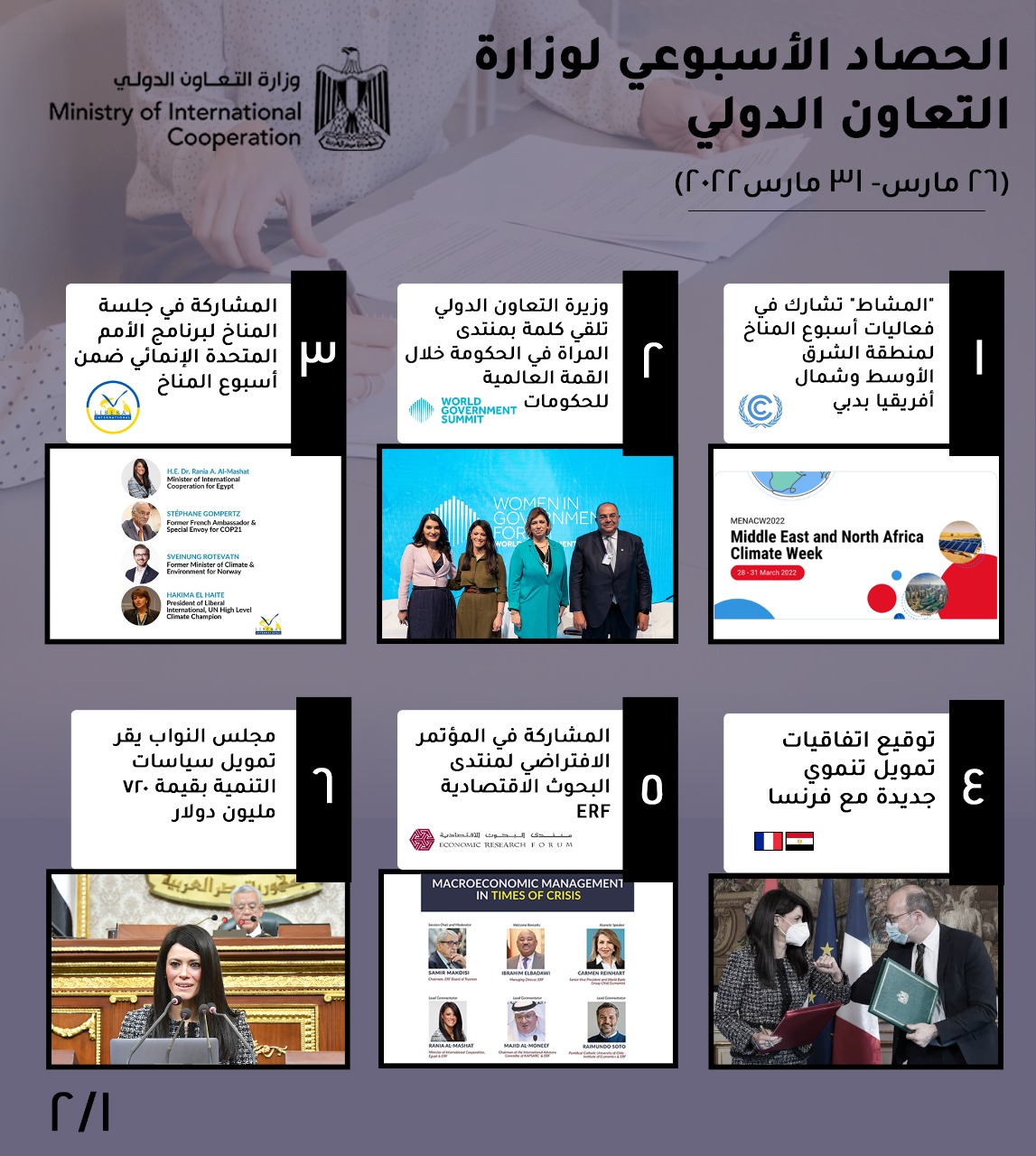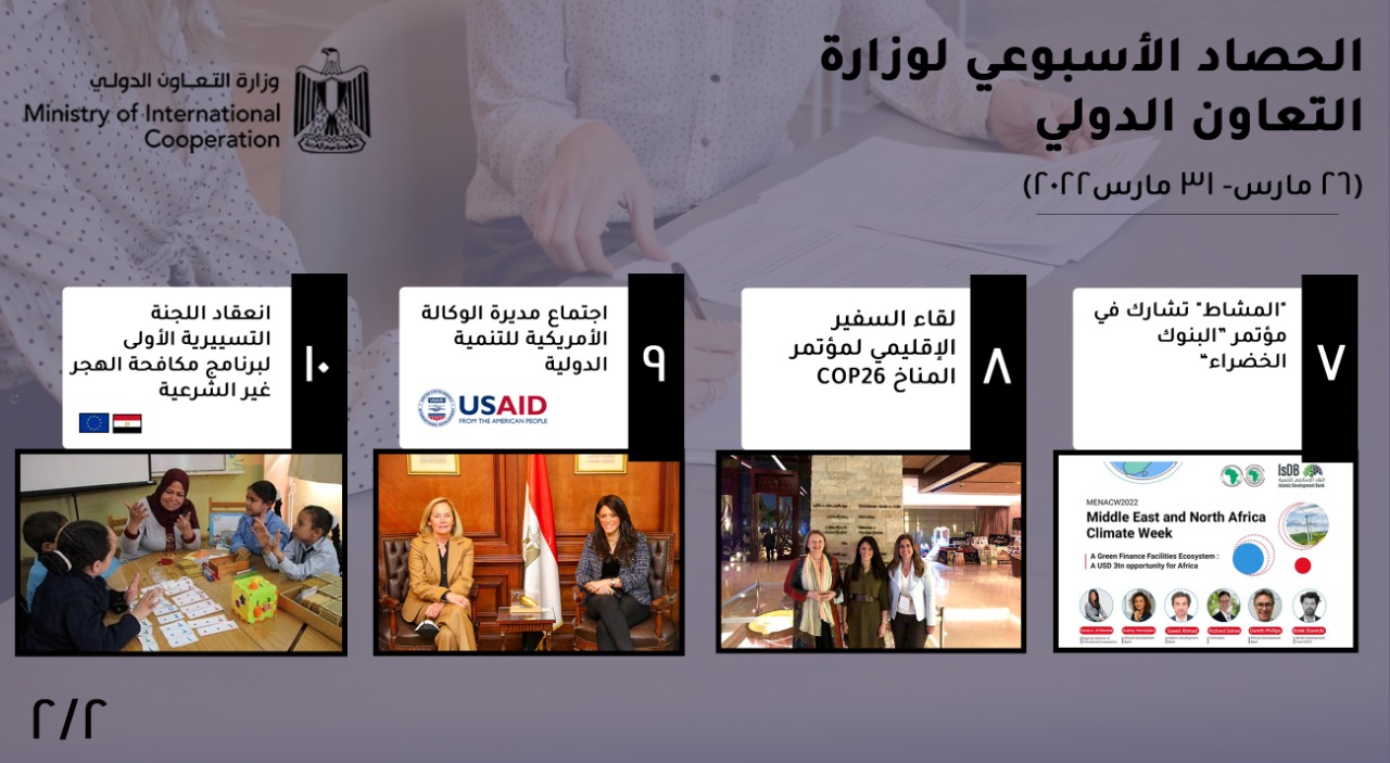 شهدت وزارة التعاون الدولي، عددًا من الفعاليات والأحداث الهامة خلال الأسبوع الجاري، في إطار الدور الذي تقوم به لدعم علاقات التعاون الإنمائي، بين مصر وشركاء التنمية متعددي الأطراف والثنائيين، لتنفيذ أجندة التنمية الوطنية التي تتسق مع الأهداف الأممية للتنمية المستدامة.