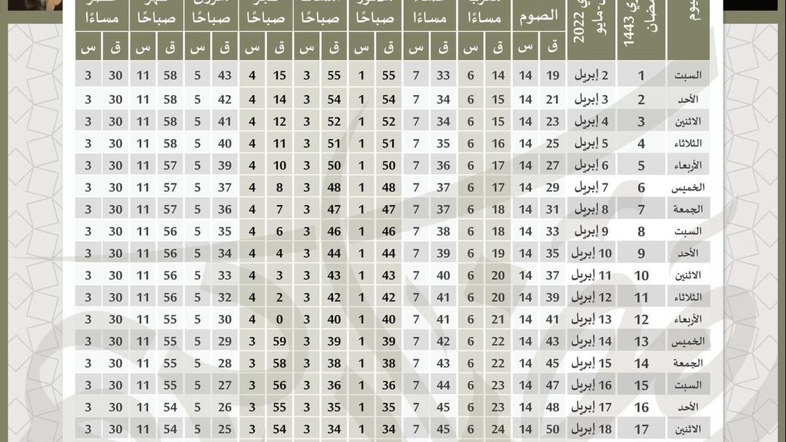 يؤذن لصلاة الفجر أول يوم رمضان 2022 في الساعة 04:15 دقيقة، ويحين موعد الشروق في أول يوم رمضان 2022 في الساعة 05:43 ، ويحين أذان الظهر في الساعة 11:58 ، بينما يحين أذان العصر في الساعة 03:30 دقيقو.