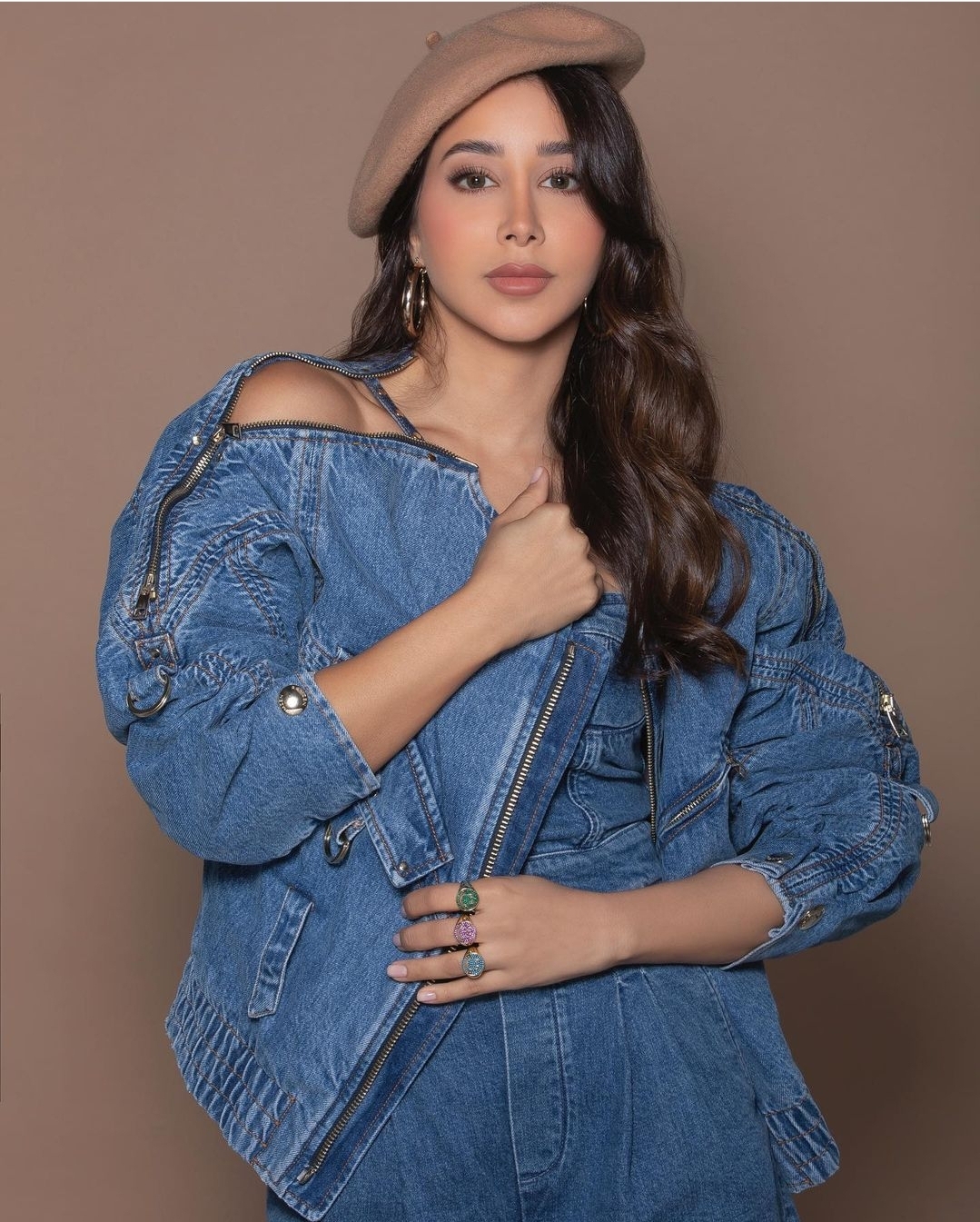 تألقت أسيل عمرانبلوك ناعم وظهرت ببنطال جينز باللون الأزرق، وعليه جاكيت جينز باللون الأزرق أيضا بأكمام طويلة وبقصة مختلفة من منطقة الأكتاف، وهو ما أبرز رقة وجمال إطلالتها.