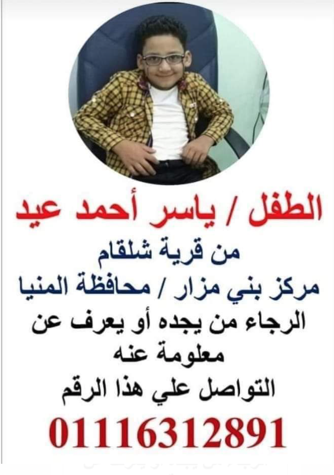 وقال في استغاثته ابني الطفل ياسر احمد عيد من قرية شلقان مركز بنى مزار محافظة المنيا متغيب منذ ثلاث ايام ومن يجده يتواصل على رقم 01116312891 .