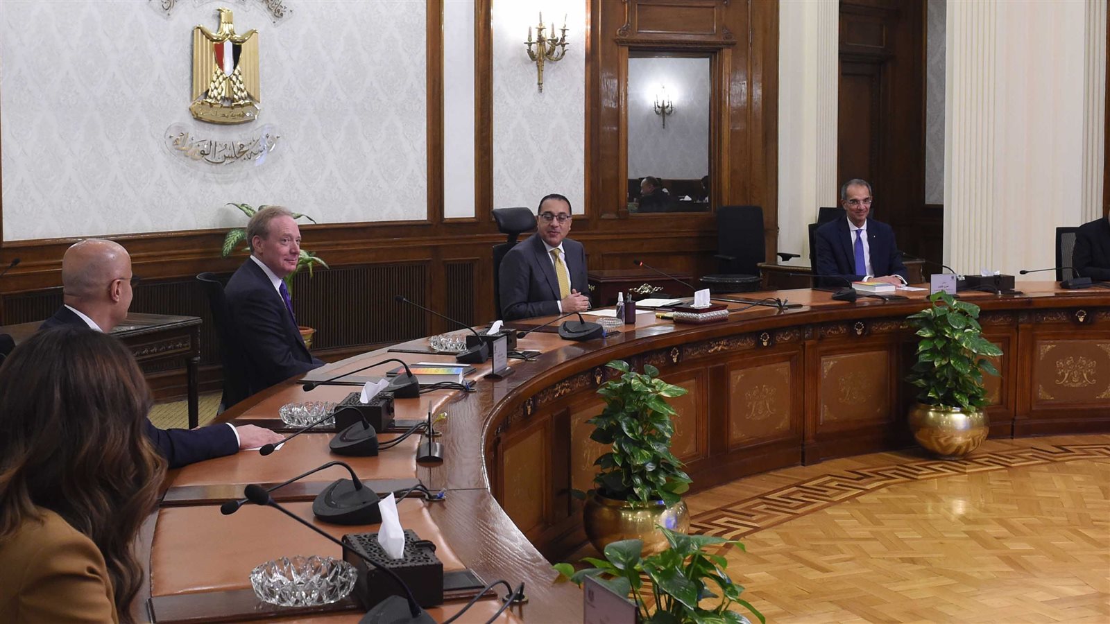 استقبل الدكتور مصطفى مدبولي، رئيس مجلس الوزراء، اليوم، "براد سميث" رئيس شركة "مايكروسوفت" ونائب رئيس مجلس إدارة الشركة، والوفد المرافق له، ، لبحث مجالات التعاون، وضم الوفد/ سامر أبو لطيف، رئيس شركة "مايكروسوفت" في الشرق الأوسط وأفريقيا،/ ميرنا عارف، مدير عام "مايكروسوفت" مصر، وعدد من مسئولي الشركة، وذلك بحضور الدكتور عمرو طلعت، وزير الاتصالات وتكنولوجيا المعلومات، والمهندس خالد العطار، نائب وزير الاتصالات للتنمية الإدارية والتحول الرقمي والميكنة، والمهندس رأفت هندي، نائب وزير الاتصالات وتكنولوجيا المعلومات لشئون البنية التحتية.