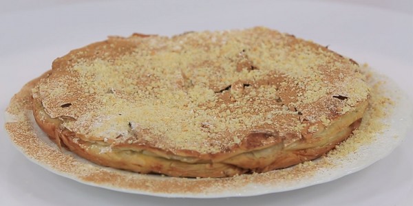 * ويقلب الخليط جيدا ثم يرص الرقاق في صنية مدهونة بالسمنة ويدهن بين الطبقات بالمرقة والسمنة او الزبدة ثم يضاف حشوة الجبن ثم ترص باقي ورق الرقاق وتكرر نفس الخطوات.