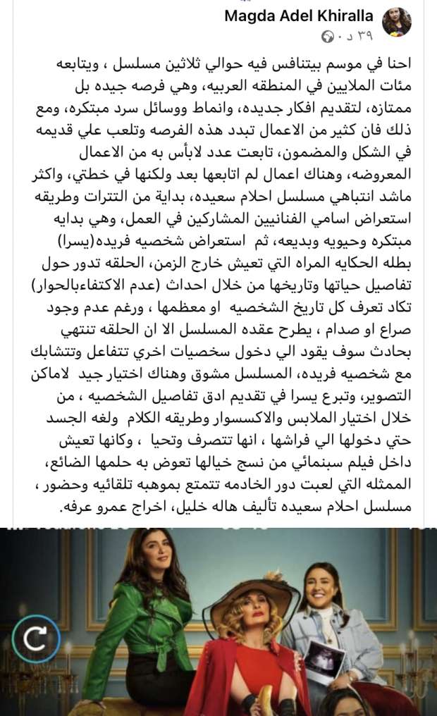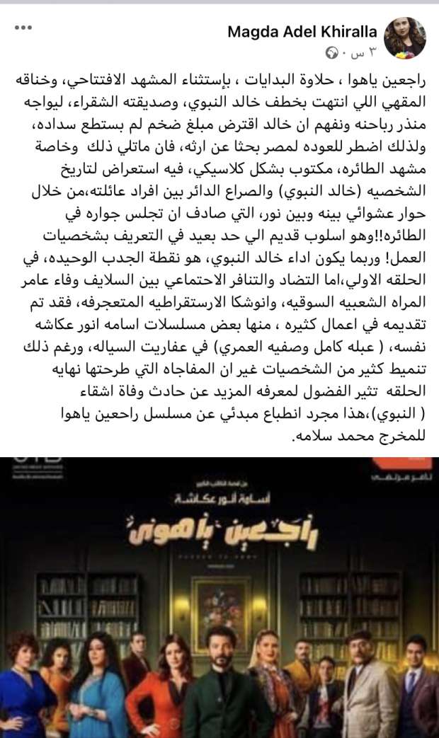 كشفت الناقدة ماجدة خير الله عن رأيها فى مسلسل “راجعين يا هوى” و"أحلام سعيدة" وذلك عبر صفحتها على موقع التواصل الاجتماعى فيسبوك.