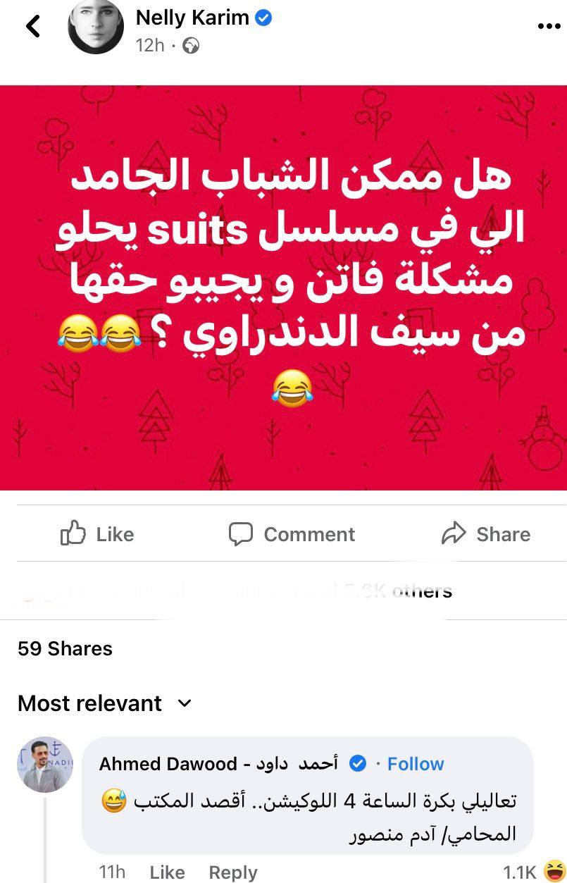 وعلقت نيللي كريم قائلة: “هل ممكن الشباب الجامد اللي في مسلسل suits يحلو مشكلة فاتن ويجيبو حقها من سيف الدندراوي ؟”.