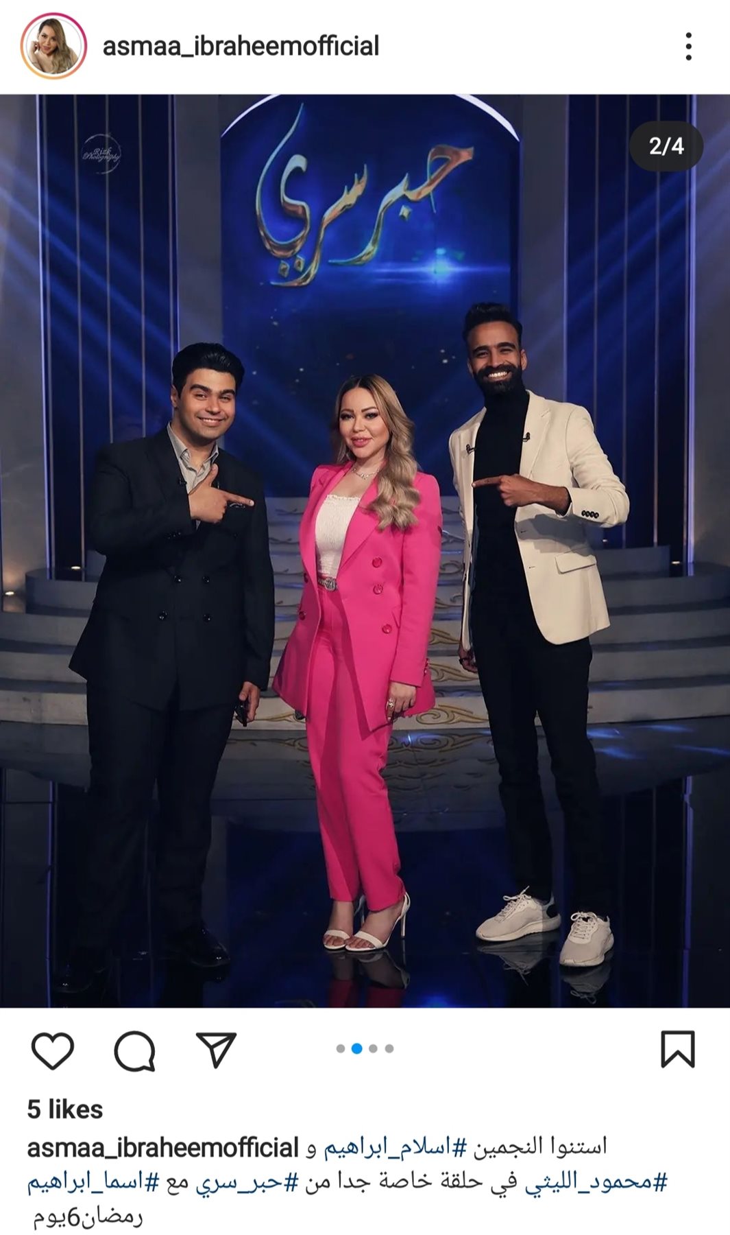 وظهرت أسما إبراهيم في الصور برفقة الفنان محمود الليثي والفنان اسلام إبراهيم، مشوقة متابعيها لحلقة غدا الخميس من برنامج “حبر سري”.