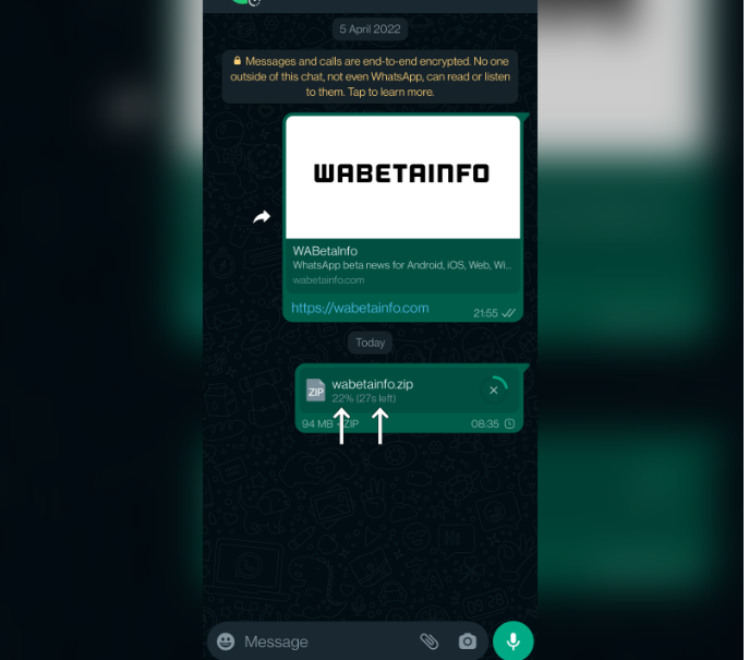 وتظهر لقطة الشاشة المنشورة بواسطة متتبع أخبار واتساب WABetaInfo، فقاعة نقل مخصصة للملف ذات حالة دائرية تملأ أثناء انتقال البيانات بين المرسل والمستقبل، في نافذة الدردشة، أسفل اسم المستند، تتيح لنا هذه المعلومات معرفة متى يجب إرسال المستند أو تنزيله بالكامل على أجهزتنا.