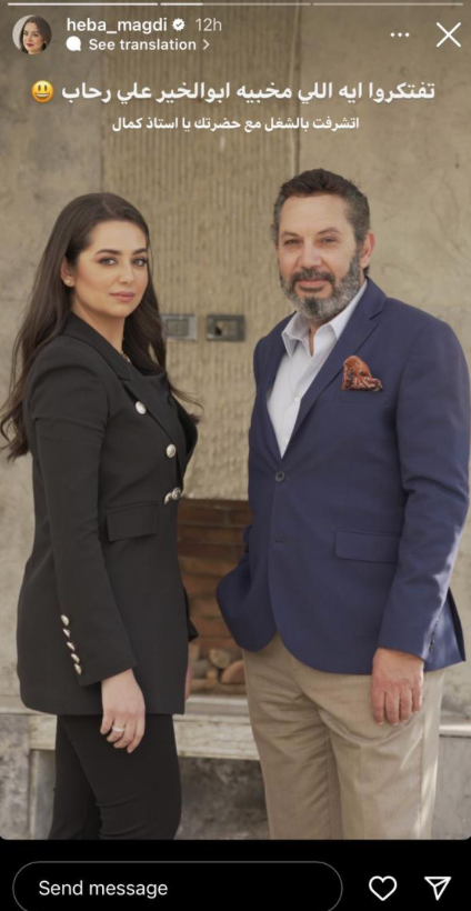وظهرت هبة مجدى برفقة النجم كمال أبو رية، وعلقت قائلة: “تفتكروا ايه اللي مخبيه أبو الخير علي رحاب، اتشرفت بالشغل مع حضرتك استاذ كمال”.