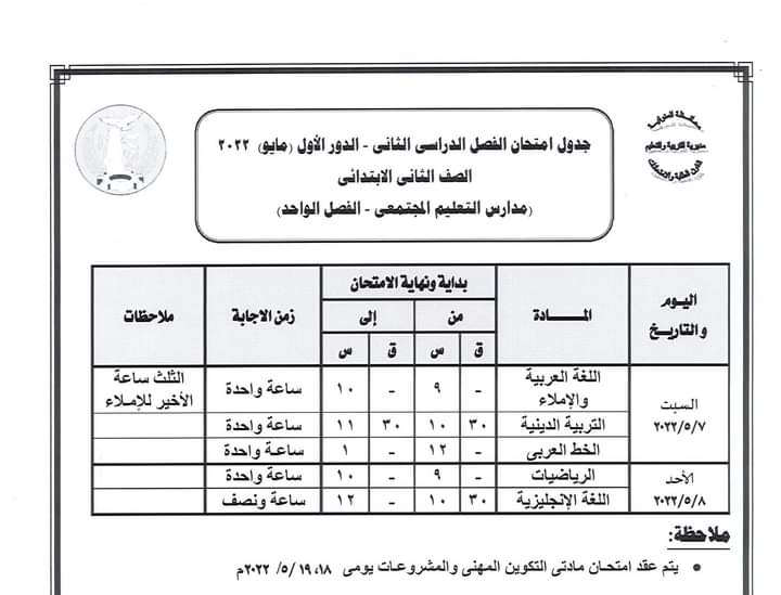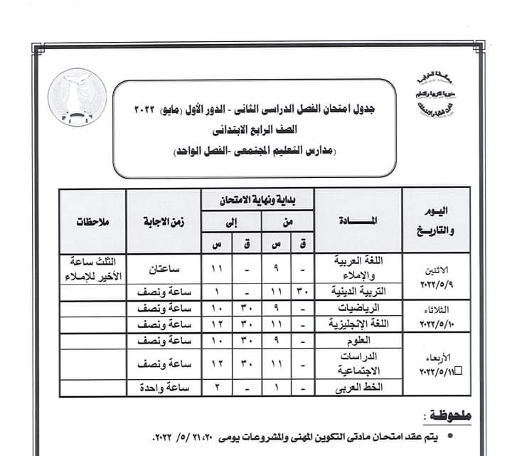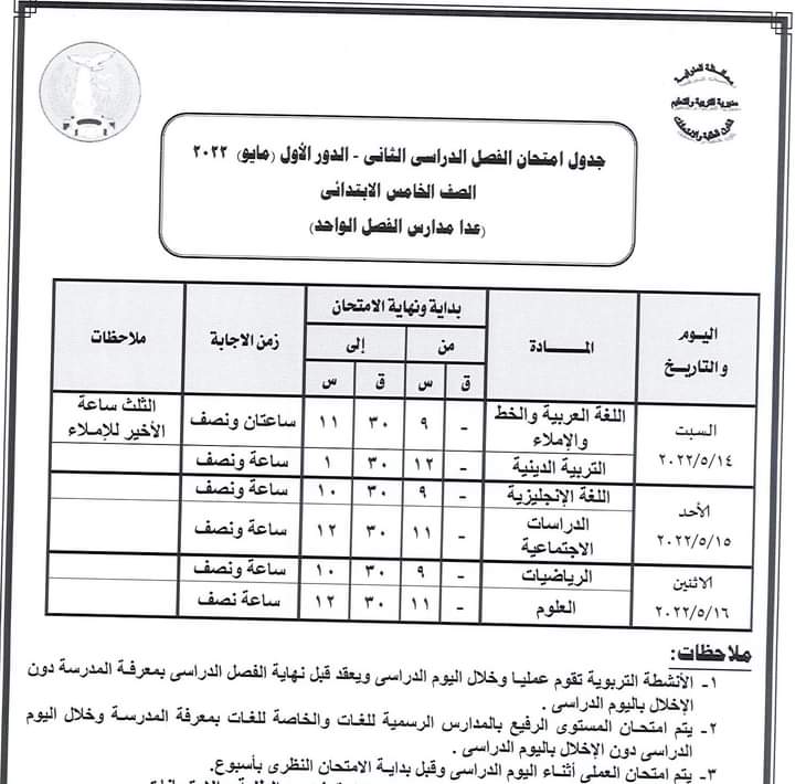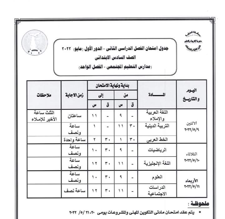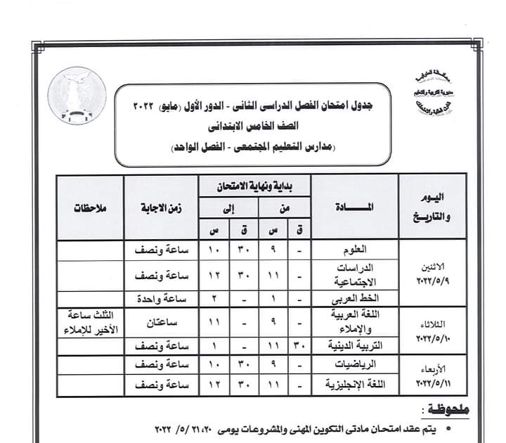 أعلنت مديرية التربية والتعليم بالمنوفية جداول سير امتحانات الدور الأول من العام الدراسي 2021 /2022 لصفوف النقل الابتدائي والإعدادي والشهادة الإعدادية العامة والمهنية ومدارس التربية الخاصة والنقل للتعليم الفني ومدارس التعليم المجتمعي ( الفصل الواحد ).