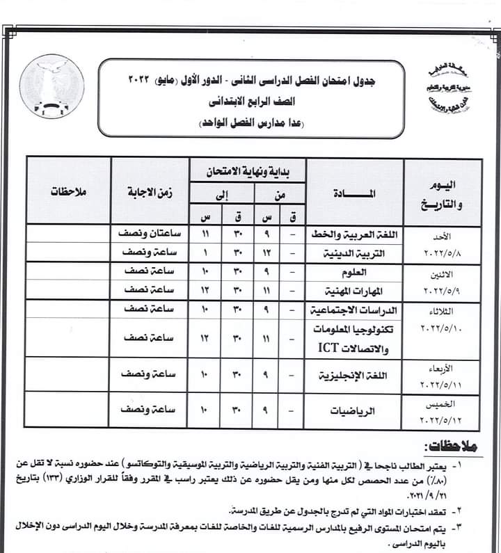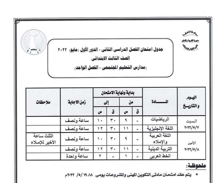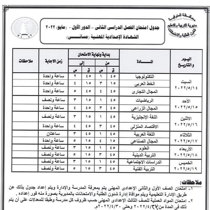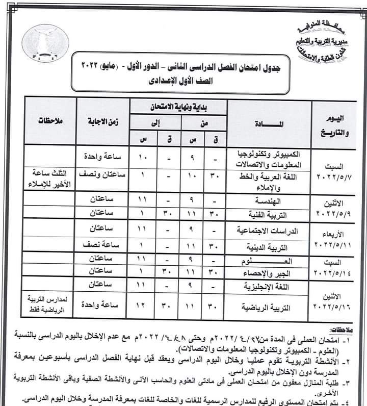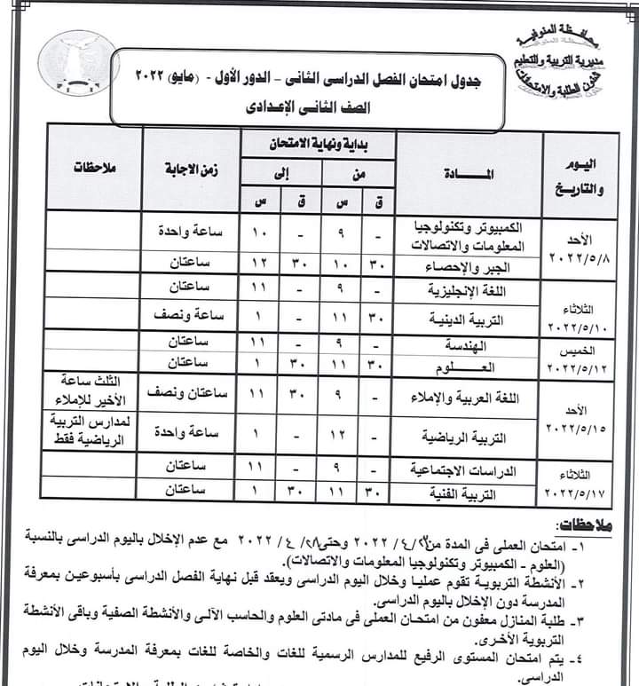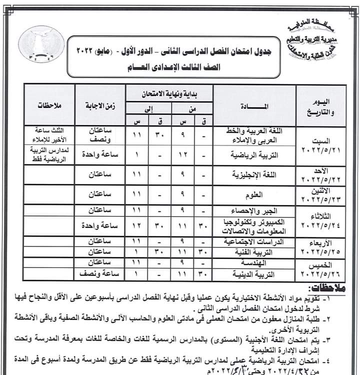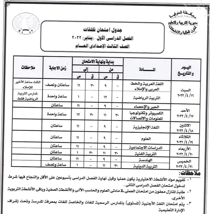 كما أعلنت عن جدول سير امتحان الشهادة الإعدادية العامة للطلبة المتخلفين عن امتحانات الفصل الدراسي الأول يناير 2022 بعذر قبلته جهة الإدارة بعد تقديم المستندات الدالة على العذر حيث تقر عقد امتحان الطلاب الذين تخلفوا عن امتحانات الفصل الدراسي الأول يناير 2022 في لجنة واحدة ومقرها مدرسة السلام الابتدائية بشبين الكوم أمام ديوان المديرية بدء من يوم السبت الموافق 16 ابريل الجاري حتى الخميس الموافق 21 من ابريل 2022 ووفقا للجدول المرفق .