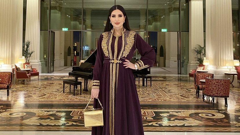 وظهرتلجين عمرانفي الصورة مرتدية عباءة ناعمة باللون البينك والأخضر الفاتح مكونة من قطعتين وبأكمام طويلة ويتوسطه حام من الخصر ، وهو ما أبرز رقة وجمال إطلالتها.