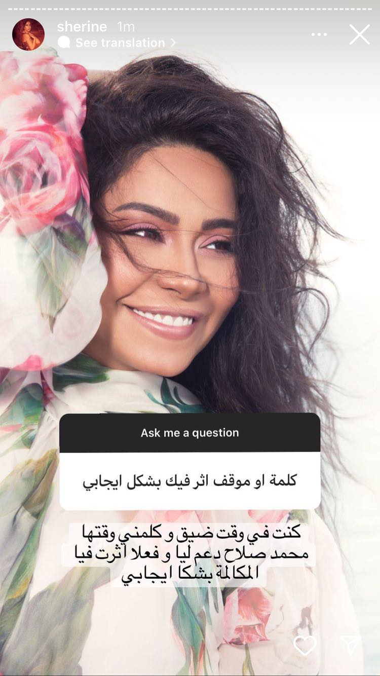 وقالت شيرين عبد الوهاب ردا على سؤال عن كلمة أو موقف أثر فيها بشكل إيجابي:" كنت في وقت ضيق وكلمني وقتها محمد صلاح دعم ليا وفعلا أثرت فيا المكالمة بشكل إيجابي".