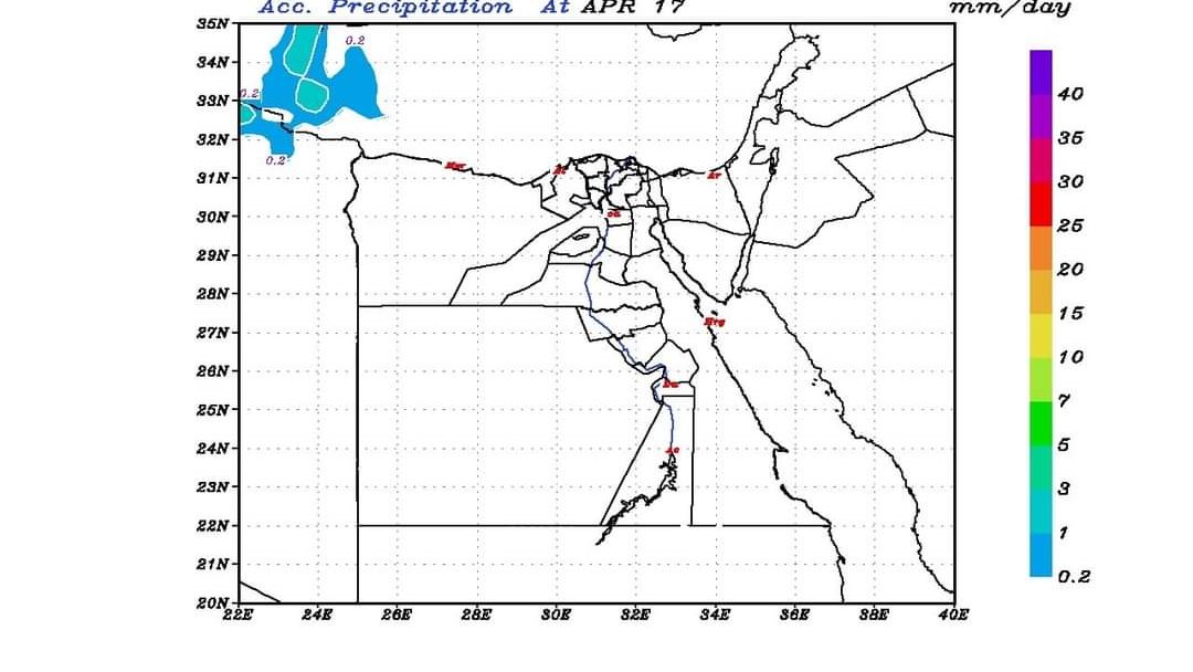 تشير نتائج نماذج التنبؤ بـ الإمطار بـ مركز التنبؤ بقطاع التخطيط وخرائط الأمطار على جمهورية مصر العربية خلال الفترة من ١٦ ابريل وحتى ١٨ أبريل ٢٠٢٢ إلى أنه من المتوقع عدم سقوط أمطار خلال فترة التنبؤ.