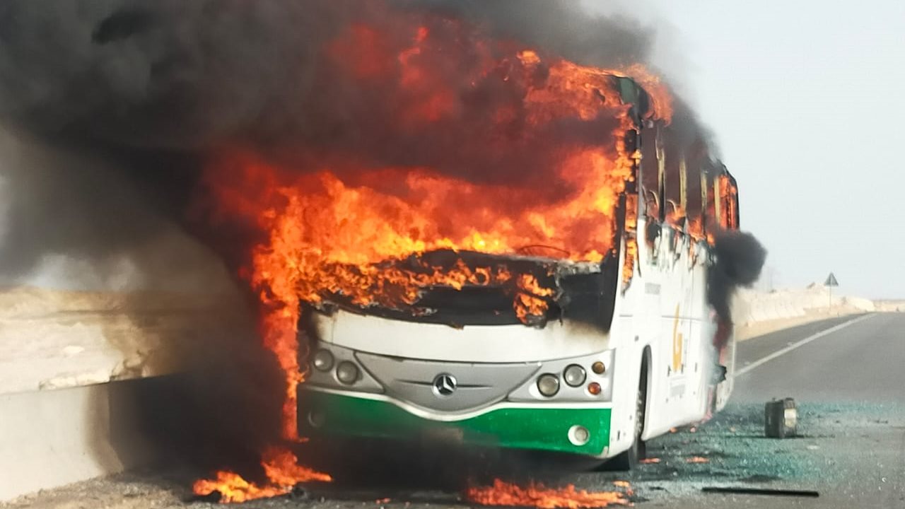 و انتقلت سيارات الإسعاف لموقع البلاغ، وتبين اشتعال النيران بأتوبيس رحلات قادم من القاهرة بطريق البحر الأحمر، يحمل رقم "ن ف ج 935" بعد حدوث عطل مفاجئ به، وتمكن الركاب وسائق الأتوبيس من النزول قبل اشتعال النيران به بدقائق معدودة دون وقوع أي إصابات.