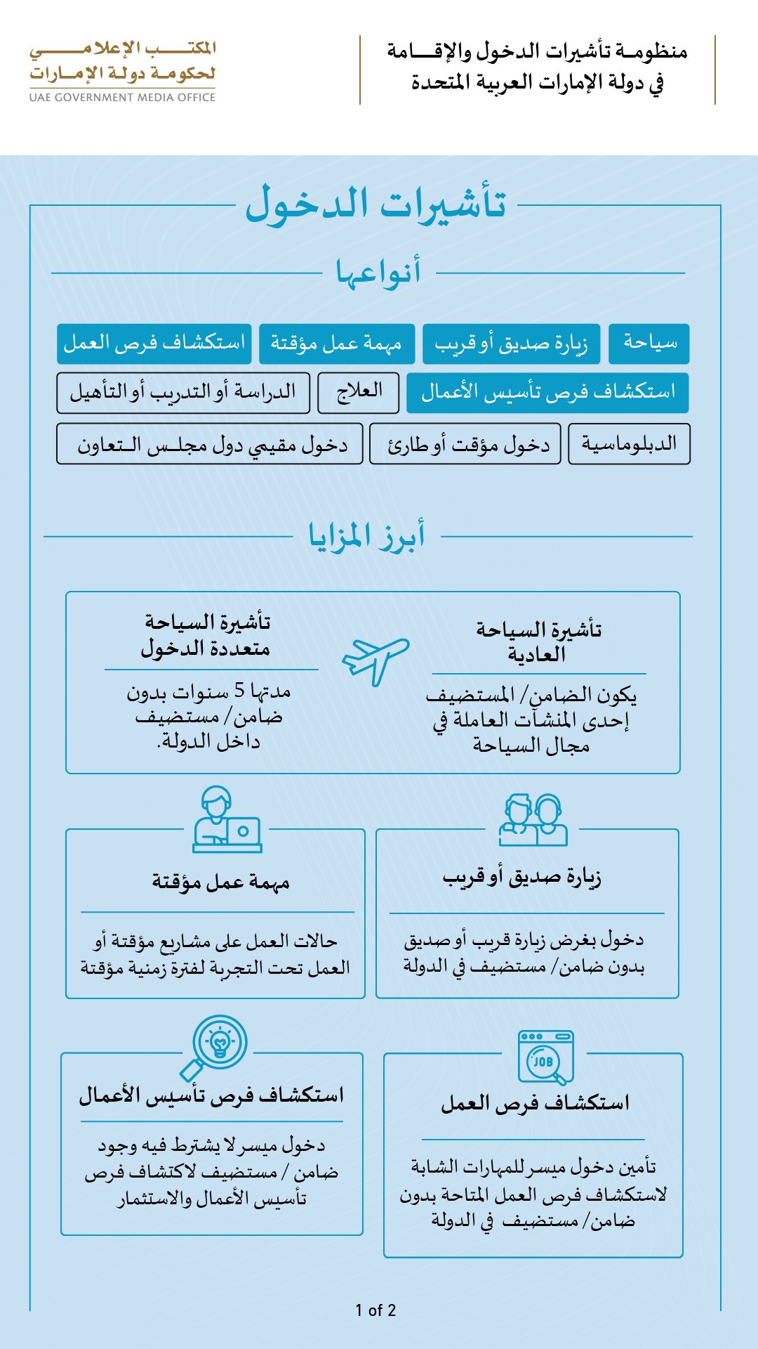 كما استحدث النظام الجديد تأشرات دخول لدولة الإمارات بأغراض متعددة تطرح لأول مرة بدون اشتراط مستضيف في الدولة وبمدد زيارة مرنة قابلة للتمديد حسب الغرض، إضافة إلى استحداث تأشيرة استكشاف فرص العمل لفئة العمالة الماهرة والمهارات الشابة من خريجي أفضل 500 جامعة في العالم.