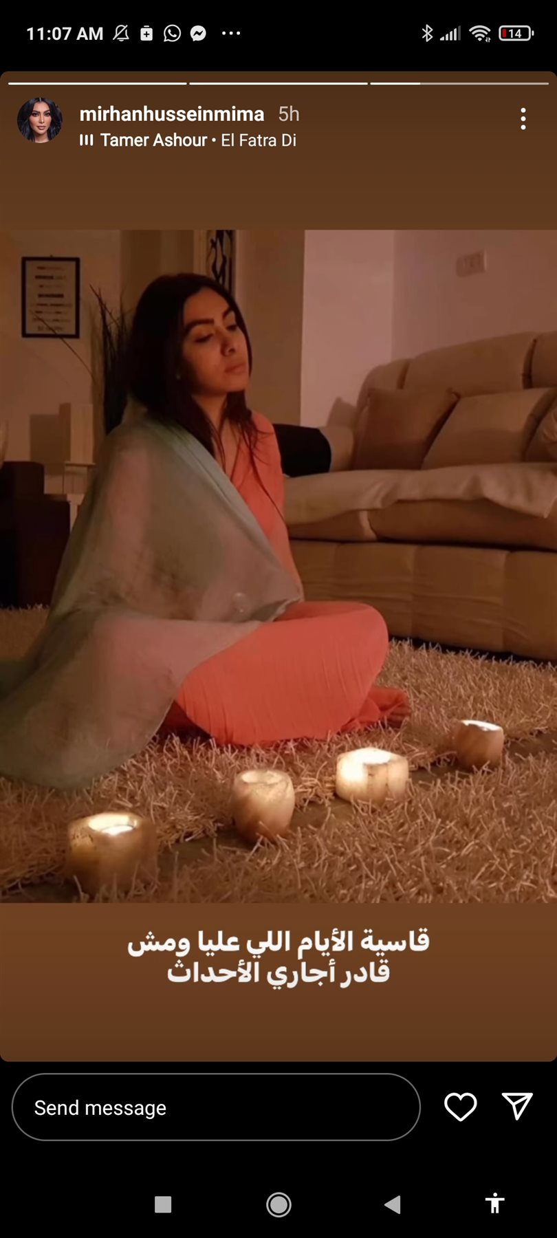 وظهرت ميرهان حسين في الصورة بإطلالة محتشمة وعلقت علي الصورة قائلة: “قاسية الأيام اللي عليا ومش قادر أجاري الأحداث”