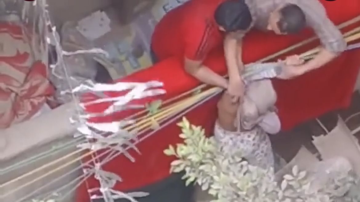 ظهر الأب في المقطع وهو ممسك بابنته من رأسها وجسدها خارج الشرفة محاولًا إلقائها فيما تشبثت الفتاة بقوة في "حبل الغسيل".