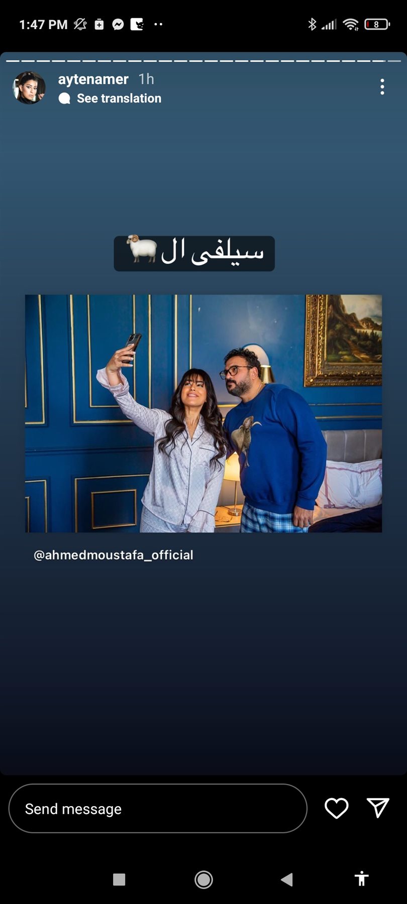 وظهرت أيتن عامر في الصورة برفقة الفنان أكرم حسني من كواليس تصوير مسلسل “مكتوب عليا”، مما نال اعجاب متابعيها.