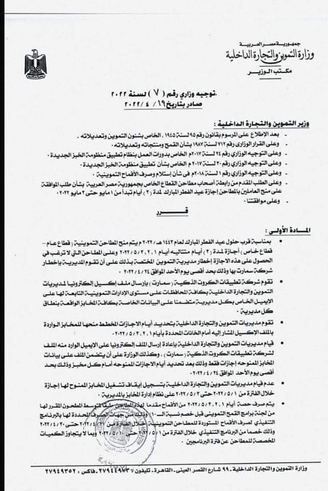 ويتضمن القرار أنه على المطاحن التي لا ترغب في الحصول على إجازة إخطار مديرية التموين المختصة»، وألزم القرار مديريات التموين بتحديد أيام الإجازات المخطط منحها للمخابز.