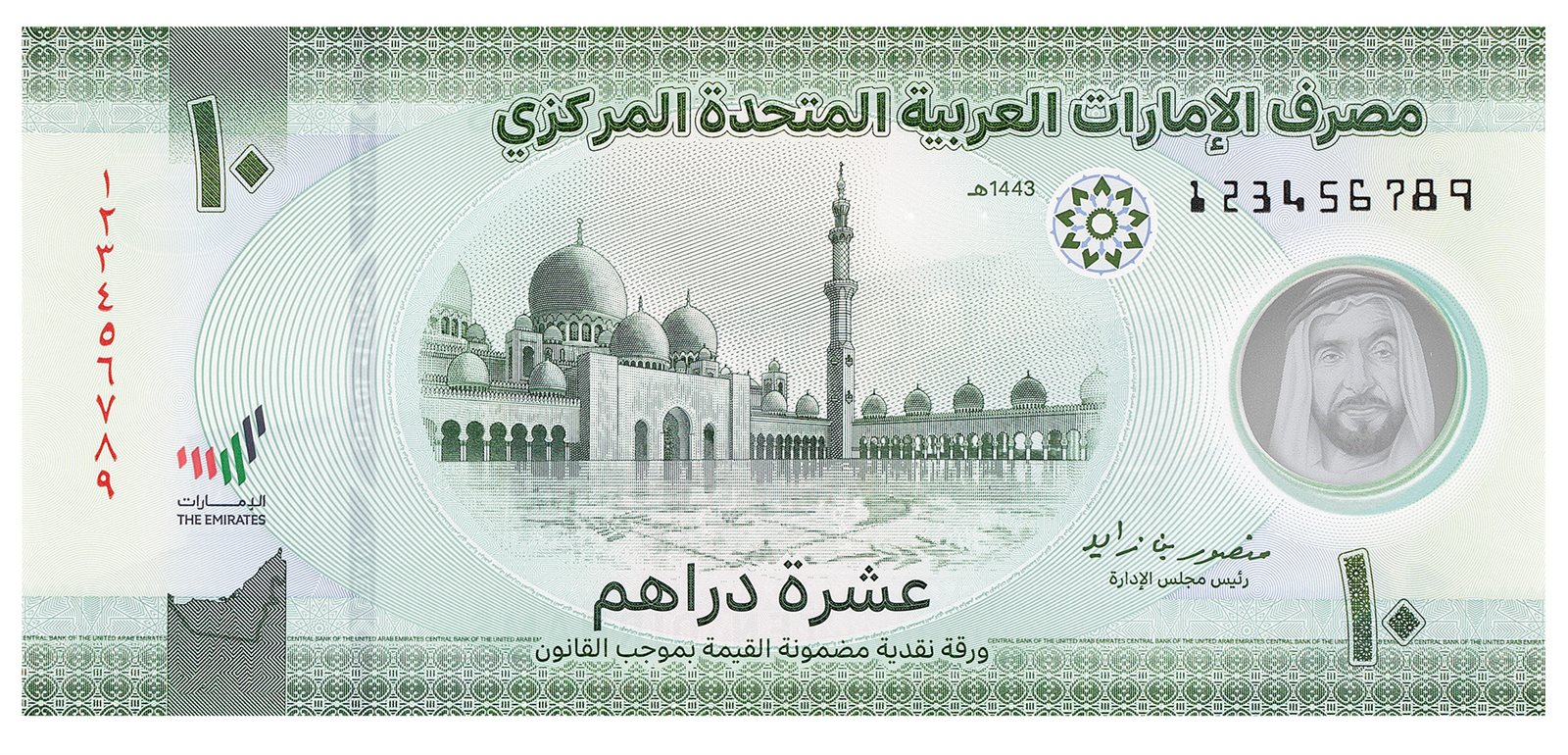 حافظت الورقة النقدية الجديدة من فئة العشرة دراهم على لونها الأخضر، ليكون مماثلًا للون الورقة النقدية الورقية المتداولة حاليًا. ويظهر في وسط الوجه الأمامي صورة مسجد الشيخ زايد الكبير الذي يُعد معلمًا دينيًا، وطنيًا، وثقافيًا بارزًا في الدولة، ويحظى بمكانة متميزة على مستوى العالم،. كما يظهر في وسط الوجه الخلفي للورقة النقدية صورة "مدرج خورفكان" كأحد المعالم الثقافية البارزة في إمارة الشارقة.