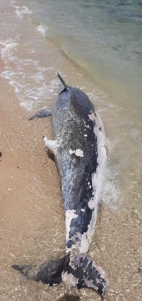 وتبين من المعاينة الظاهرية لجسم الدولفين أنه من النوع ذي الأنف الزجاجي، ذكر ويبلغ طوله 203 سم وعرضه 60 سم، وطول الزعنفة الظهرية 12 سم، طول الزعنفة الذيلية 70 سم، وعدد ناحية واحدة من الأسنان 24 سنة.