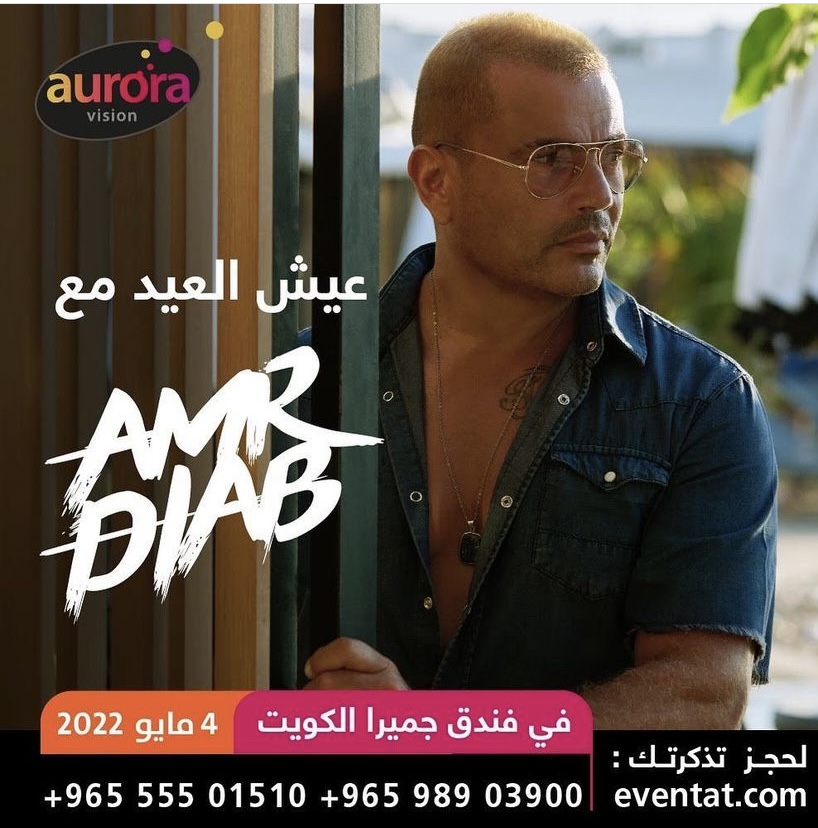 كما يحيي الفنان عمرو دياب في 4 مايو 2022 حفلاً غنائياً في فندق جميرا الكويت.