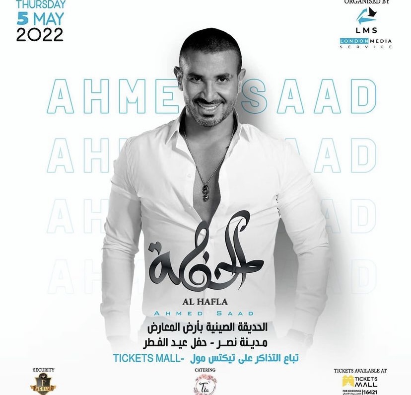 يحيى الفنان أحمد سعد حفل عيد الفطر المبارك يوم 5 مايو بالحديقة الصينية بمدينة نصر .