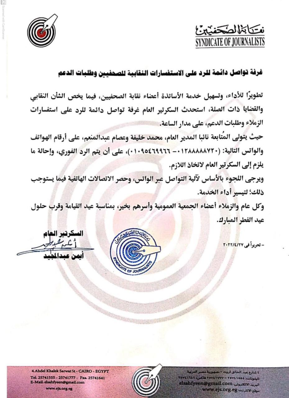 و استحدث السكرتير العام غرفة تواصل دائمة للرد على استفسارات الزملاء وطلبات الدعم، على مدار الساعة. حيث يتولى المُتابعة نائبا المدير العام، محمد خليفة وعصام عبدالمنعم، على أرقام الهواتف والواتس التالية: (01288888720- 01095469966)، على أن يتم الرد الفوري، وإحالة ما يلزم إلى السكرتير العام لاتخاذ اللازم.