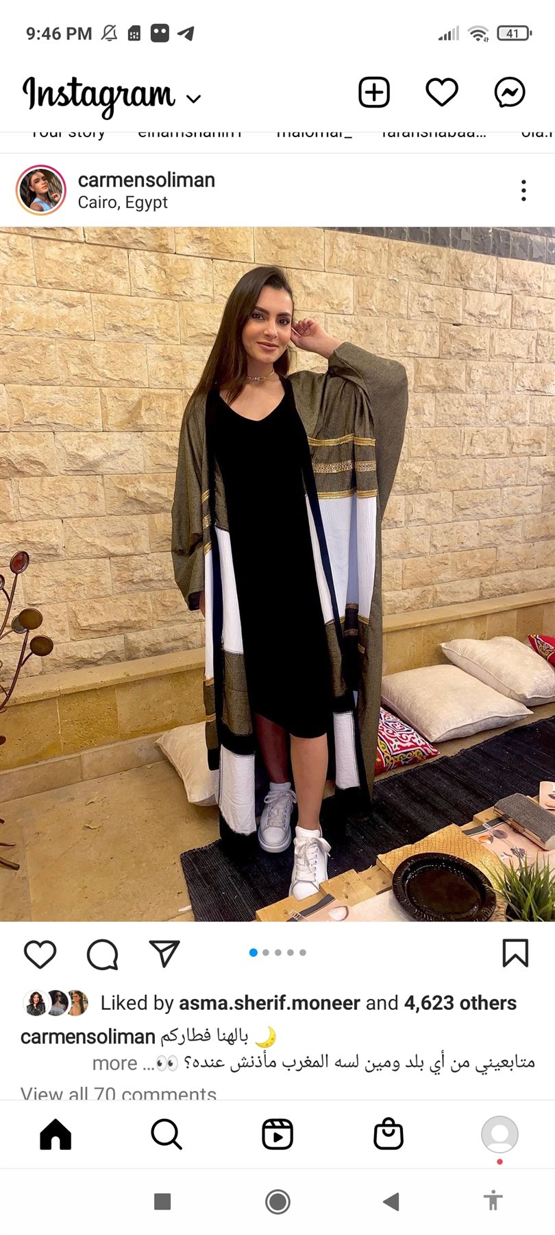 وظهرت كارمن سليمان في الصور مرتدية عباءة طويلة بألوان مُبهجة، تاركة خصلات شعرها منسدلة علي أكتافها.