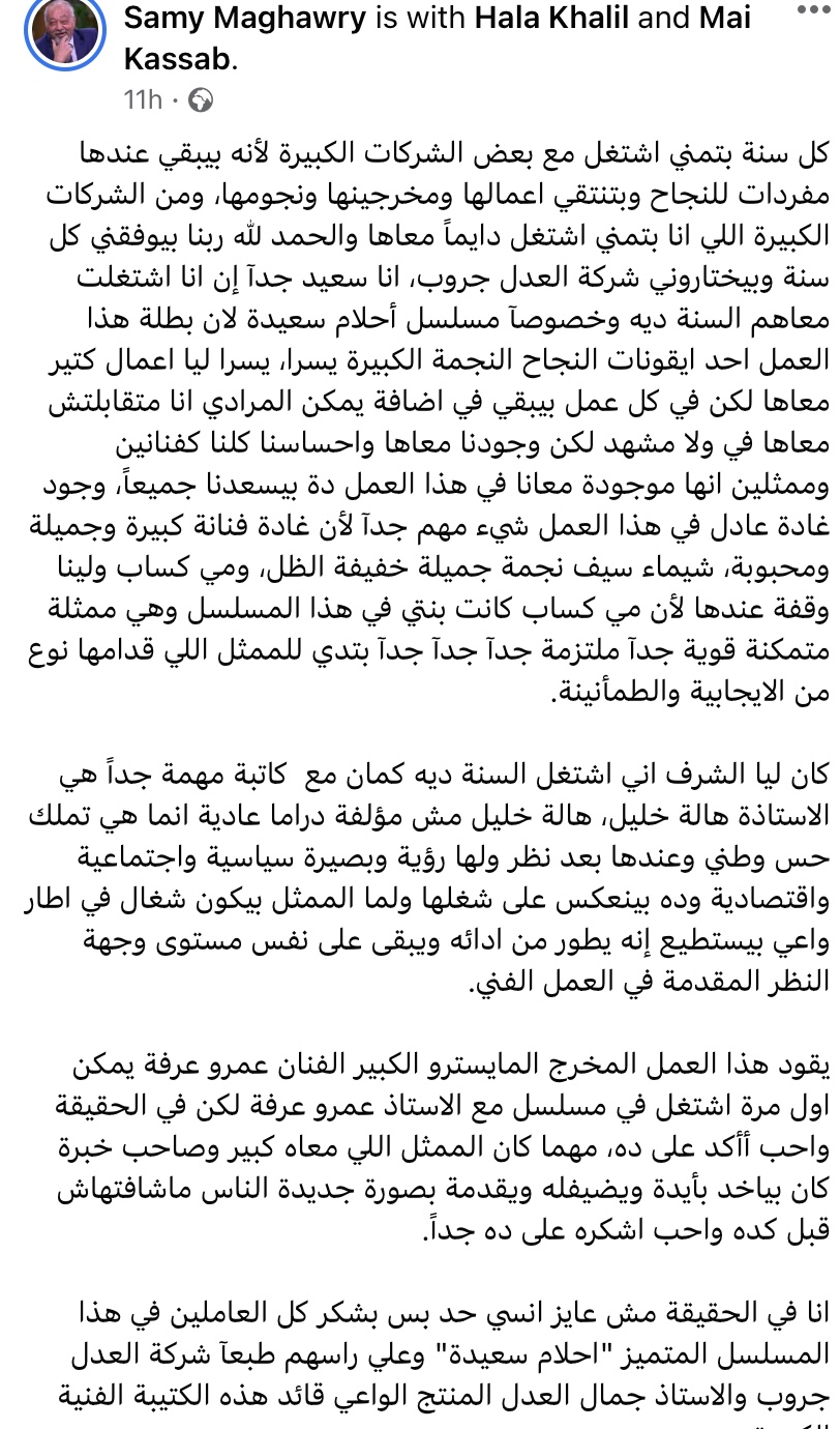 وكتب سامى مغاورى عبر حسابه بموقع التواصل الاجتماعي فيسبوك: "كل سنة بتمني اشتغل مع بعض الشركات الكبيرة لأنه بيبقي عندها مفردات للنجاح وبتنتقي أعمالها ومخرجينها ونجومها، ومن الشركات الكبيرة اللي أنا بتمني اشتغل دايماً معاها والحمد لله ربنا بيوفقني كل سنة وبيختاروني شركة العدل جروب".