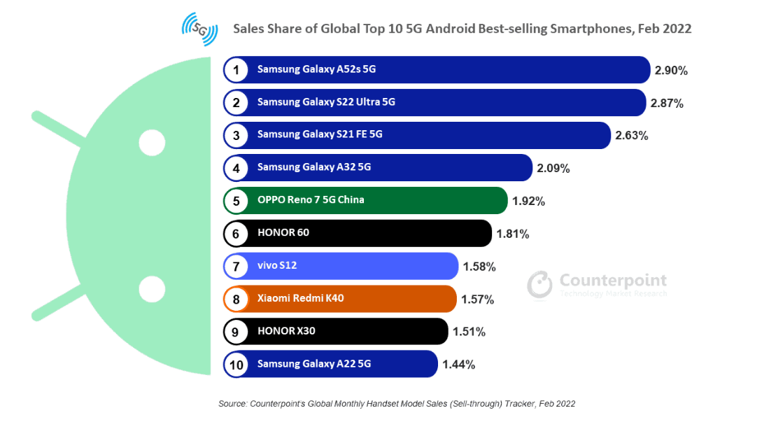 وفي فبراير 2022، ووفقا لشركة Counterpoint، كانت سامسونج الشركة الرائدة بلا منازع في قطاع أجهزة أندرويد مع دعم شبكات الجيل الخامس 5G، واحتلت 5 من أجهزتها المراكز العشرة الأوائل من الطرازات الأكثر شعبية في هذه الفئة، وهي Galaxy A52s 5G و Galaxy S22 Ultra 5G و Galaxy S21 FE 5G و Galaxy A32 5G؛ التي احتلت المراكز من الأول إلى الرابع على التوالي.