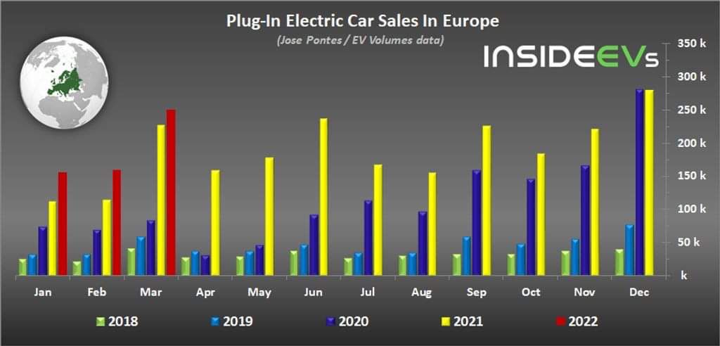 وفقًا لبيانات إنتاج السيارات الكهربائية ، التي شاركها Jose Pontes ، تم تسجيل ما يقرب من 250 ألف مركبة موصولة بالكهرباء (سواء كهربائية بالكامل أو هجينة) جديدة في أوروبا شهر مارس وهو ما يزيد بنسبة 10٪ عن العام الماضي. والأهم من ذلك أنها ثاني أعلى نتيجة شهرية على الإطلاق، كما تحسنت الحصة السوقية لمركبات الهايبرد والكهربائية بالكامل أي المركبات التي تحمل مكون كهربائي، لتصل إلى 22٪ في شهر مارس بعد أن كانت 20٪ فقط في فبراير.