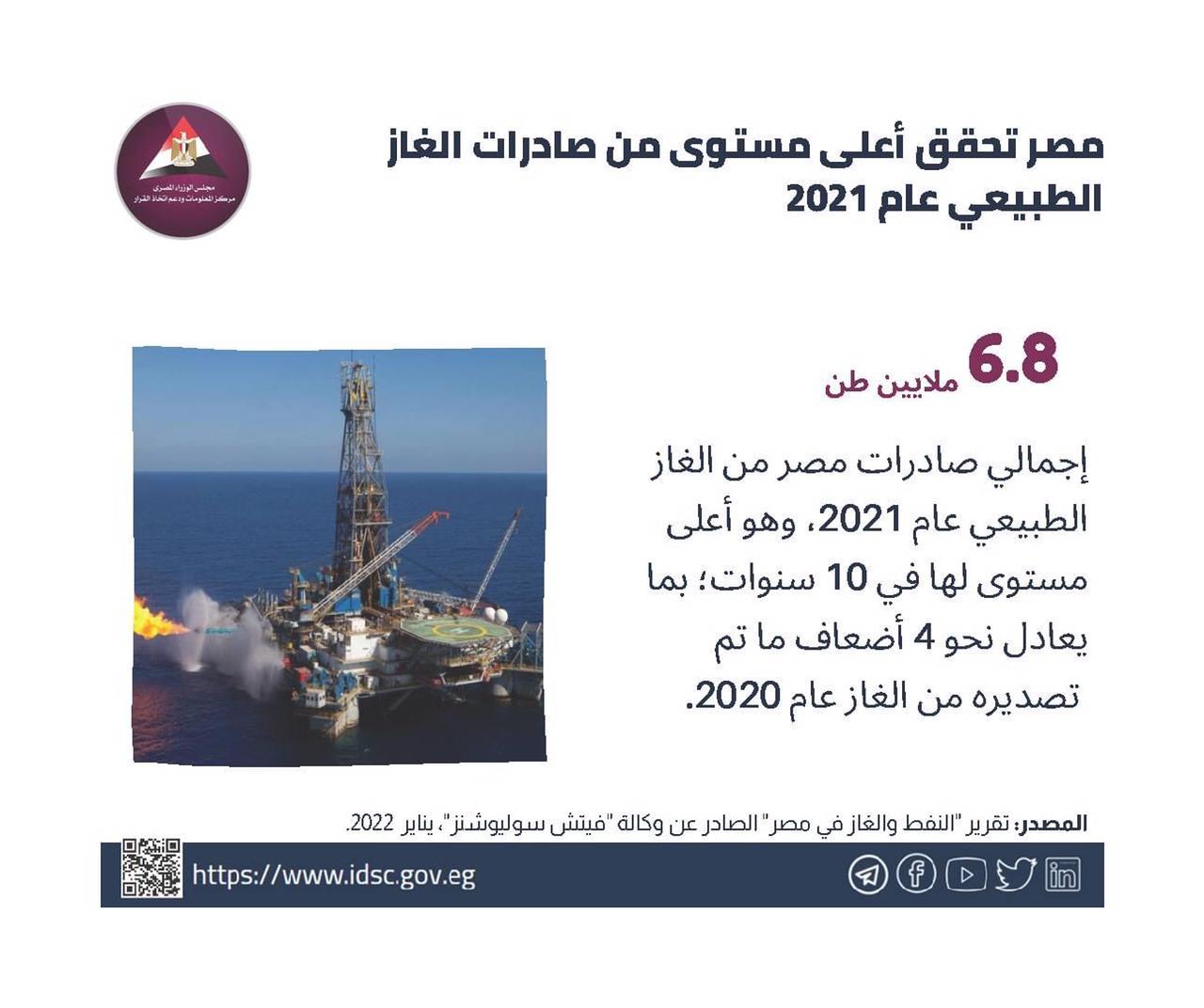 وأوضح الانفوجراف أنه وفقًا لتقرير "النفط والغاز في مصر" الصادر عن وكالة "فيتش سوليوشنز" في يناير 2022، أنه بلغ إجمالي صادرات مصر من الغاز الطبيعي نحو 6.8 ملايين طن عام 2021.