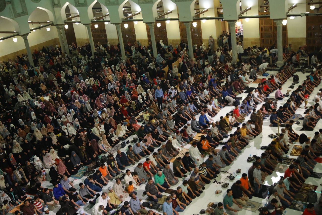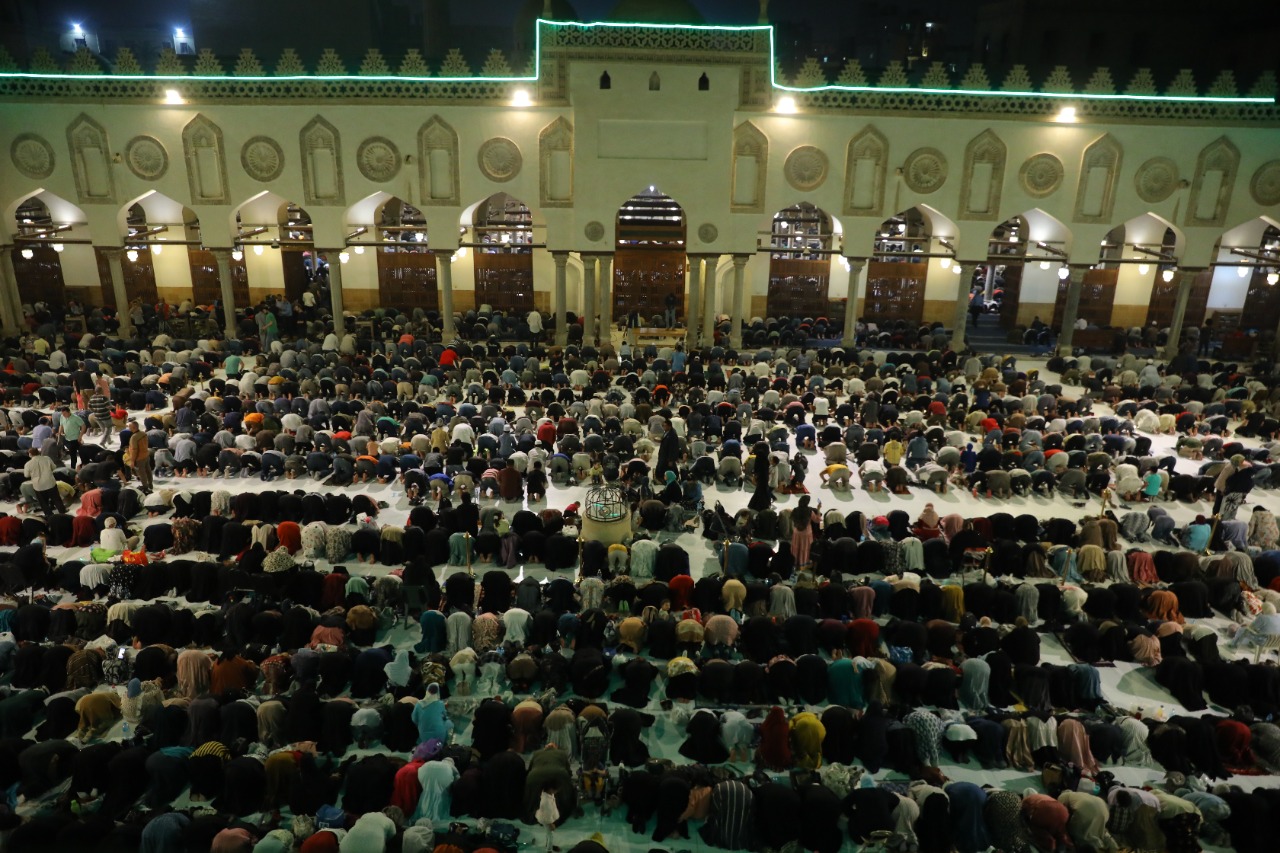 واصطف المصليين فى الساعات الاولى من صلاة العشاء خلف امام المسجد، وعقب ذلك ازدحم المكان ليلتف المصلين في الساحة الخارجية لجامع الازهر.