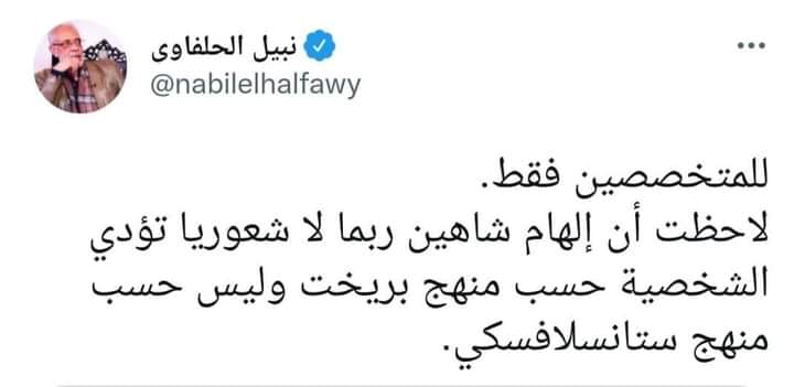 أثار الممثل القدير نبيل الحلفاوي، إشكالية التمثيل بين منهج "بريخت" و"ستانسلافسكي"، عبر تغريدة دونها لتقييم أداء الفنانة إلهام شاهين في مسلسل "بطلوع الروح"، إذ كتب: "للمتخصصين فقط، لاحظت أن إلهام شاهين ربما لا شعوريا تؤدي الشخصية حسب منهج بريخت وليس حسب منهج ستانسلافسكي".