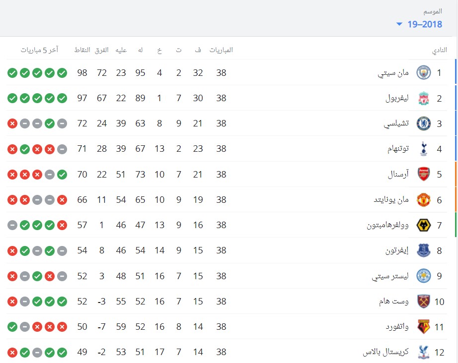 في موسم 2018 - 2019، توج مانشستر سيتي بطلا لمسابقة الدوري الإنجليزي برصيد 98 نقطة، وبفارق نقطة وحيدة عن ليفربول صاحب المركز الثاني.