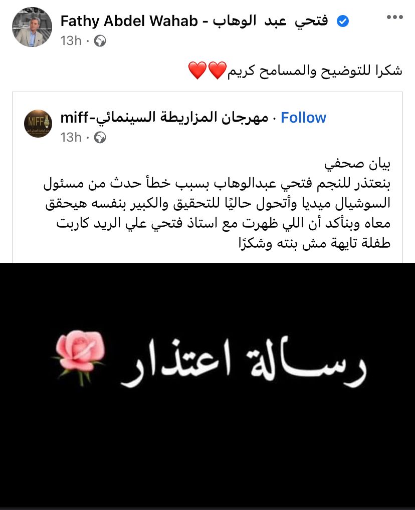 وجه مهرجان المزاريطة السينمائى اعتذار رسمى الى الفنان فتحى عبد الوهاب بسبب الشائعة التى طالته بعد الصورة التى تم تداولها وهو يحمل طفلة فى يده وهو ما اعتقده البعض انها ابنته.