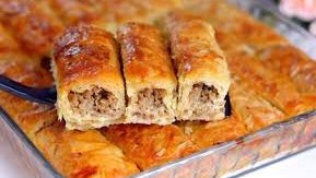- في صينية مدهونة بالسمنة الساخنة ضعي الطبقات الأولى من الرقاق واحدة تلو الأخرى ثم ضعي اللحمة المفرومة ووزعييها بالتساوي على الرقاق واتركى الأطراف دون لحم.