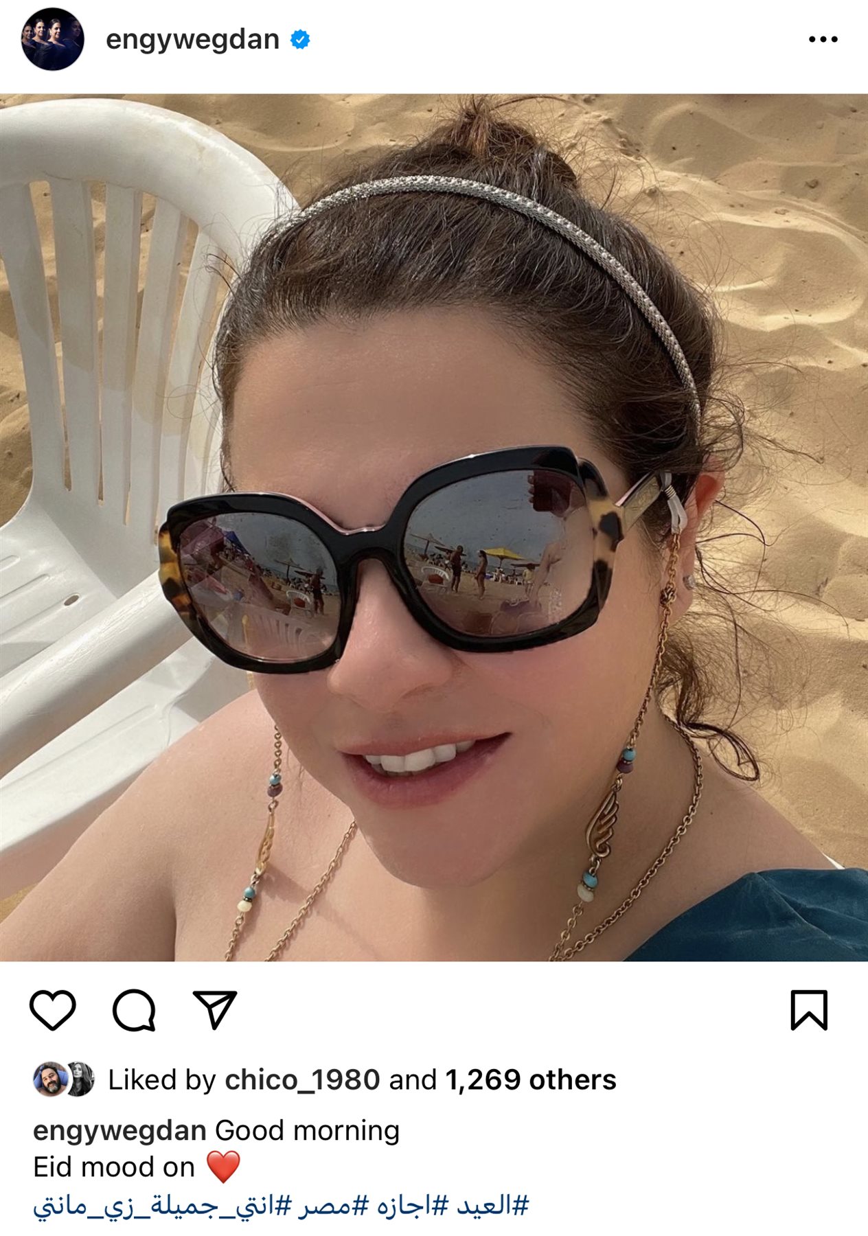 وظهرت إنجي وجدان في الصورة، خلال عطلتها الصيفية علي الرمال، وعلقت كاتبة: “صباح الخير، اجازة العيد”.
