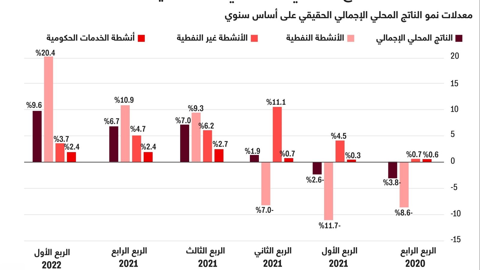 سجلت السعودية نموًا في الناتج المحلي الإجمالي بنسبة 9.6٪ في الربع الأول من عام 2022 مقارنة بالفترة نفسها من عام 2021، محققًا أعلى معدل نمو منذ عام 2011، وفقًا لبيانات حكومية نشرتها وكالة الأنباء السعودية الرسمية.