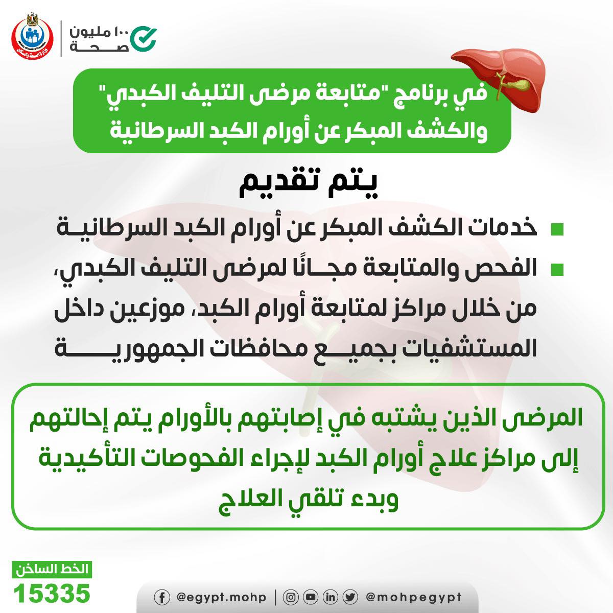 وأوضحت وزارة الصحة والسكان ، إنه يتم تقديم خدمات المبكر عن أورام الكبد السرطانية بالمجان.