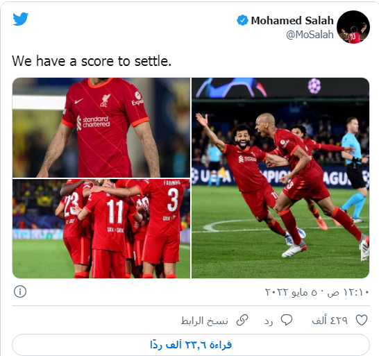 وقصد صلاح بتلك التغريدة تحفيز نفسه وزملائه لتعويض خسارة عام 2018 من ريال مدريد، التي مُني فيها الريدز بهزيمة 1ـ3 في مباراة عصيبة شهدت أحداث مؤسفة، بإصابة صلاح وأخطاء كارثية من الحارس «كاريوس» منحت ريال مدريد البطولة على طبق من فضة.