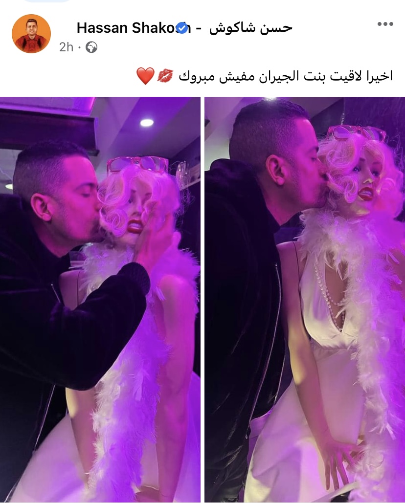 وظهر حسن شاكوش وهو يقبل تمثال مارلين مونرو وعلق قائلا:"أخيرا لقيت بنت الجيران.. مفيش مبروك.