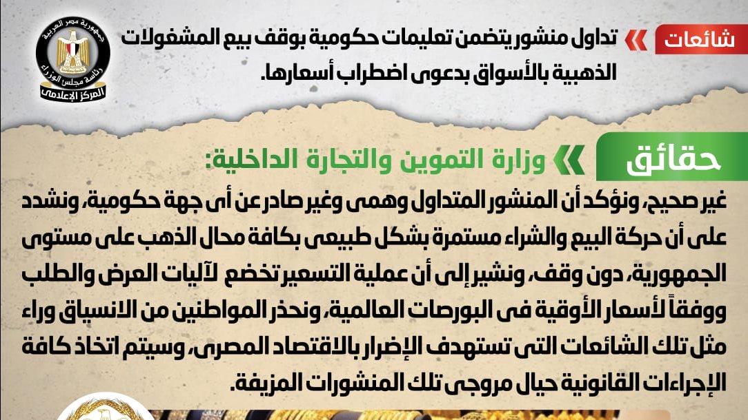 فقد تداولت بعض المواقع الإلكترونية وصفحات التواصل الاجتماعي منشوراً يتضمن تعليمات حكومية بوقف بيع المشغولات الذهبية بالأسواق بدعوى اضطراب أسعارها، وقد قام المركز الإعلامي لمجلس الوزراء بالتواصل مع وزارة التموين والتجارة الداخلية، والتي نفت تلك الأنباء، مؤكدةً أنه لا صحة لوقف بيع المشغولات الذهبية بالأسواق بدعوى اضطراب أسعارها، وأن المنشور المتداول وهمي وغير صادر عن أي جهة حكومية، مُشددةً على أن حركة البيع والشراء مستمرة بشكل طبيعي بكافة محال الذهب على مستوى الجمهورية، دون وقف، مُشيرةً إلى أن عملية التسعير تخضع لآليات العرض والطلب ووفقاً لأسعار الأوقية في البورصات العالمية، مُحذرةً المواطنين من الانسياق وراء مثل تلك الشائعات التي تستهدف الإضرار بالاقتصاد المصري، وسيتم اتخاذ كافة الإجراءات القانونية حيال مروجي تلك المنشورات المزيفة.