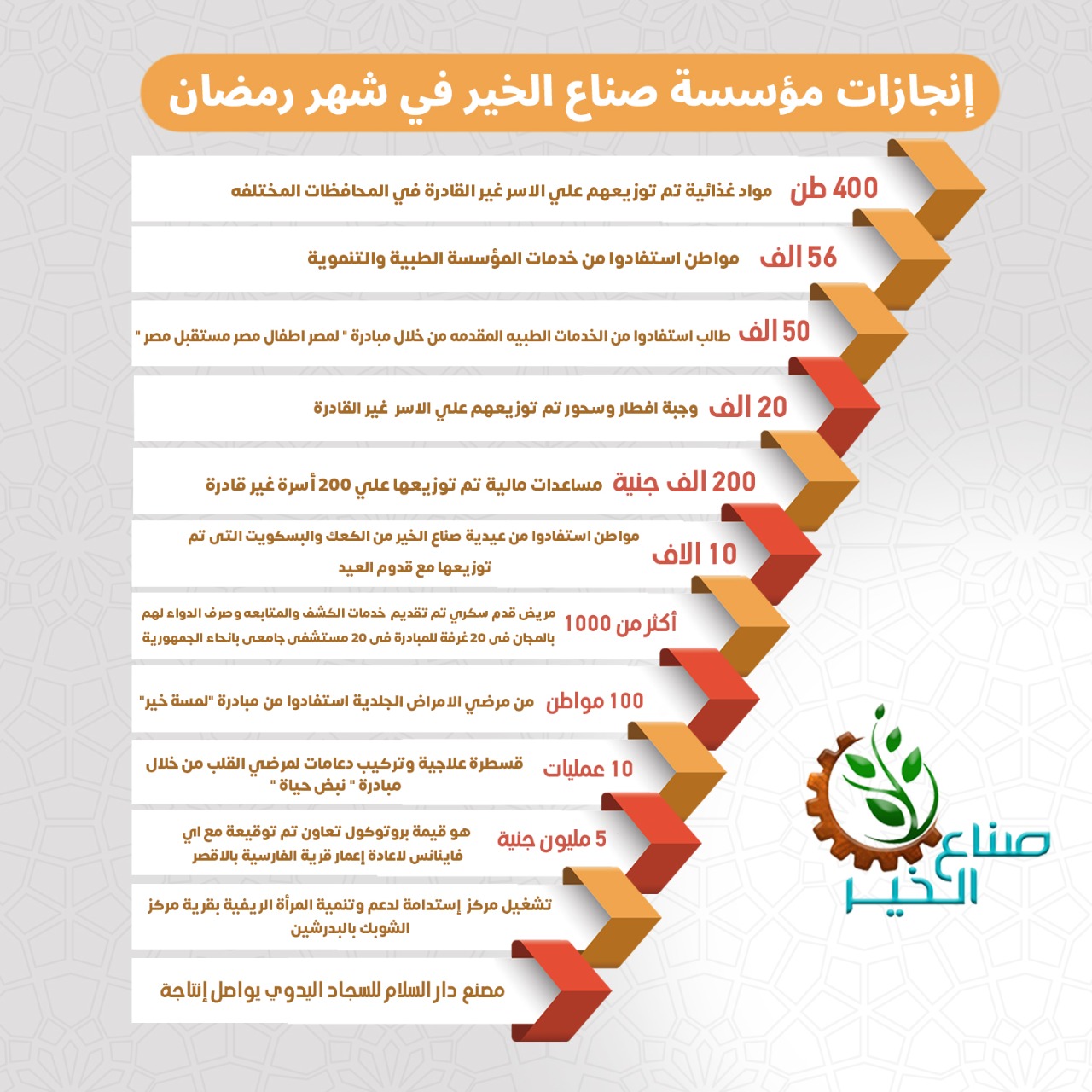 واوضح عبدالفتاح ان صناع الخير واصلت ايضا نشاطها التنموي خلال ايام الشهر الكريم حيث افتتحت مركز استدامة لدعم وتنمية المرأة الريفية بقرية نزلة الشوبك بالجيزة بحضور اللواء احمد راشد محافظ الجيزة بهدف احياء الحرف التراثية واليدوية وتوفير فرص عمل للسيدات المعيلات كما واصلت صناع الخير جهودها فى تشغيل مصنع دار السلام لصناعة السجاد اليدوي بالفيوم ومتابعة الصيادين الذين تسلموا مراكب صيد من المؤسسة فى محافظات اسوان وقنا والدقهلية وتذليل اي صعاب تواجههم لضمان تشغيلهم للمراكب وتحقيق اقصى استفادة ممكنة لهم