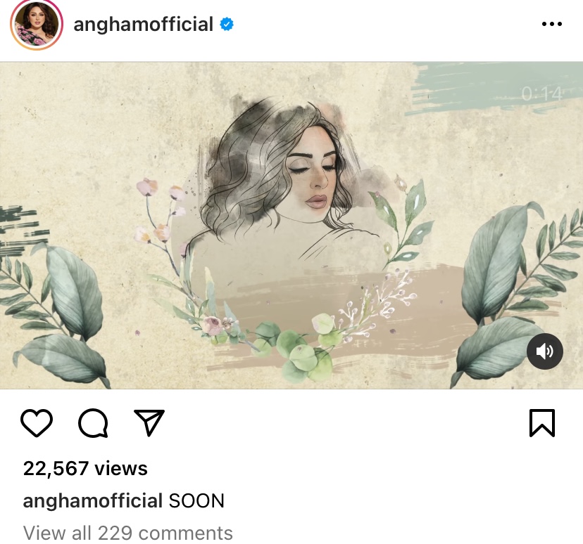طرحت الفنانة أنغام، مقطع موسيقى من أغنية جديدة لها، عبر حسابها على تطبيق إنستجرام، وعلقت عليه: قريبا، في إشارة لاقتراب موعد طرح الأغنية.