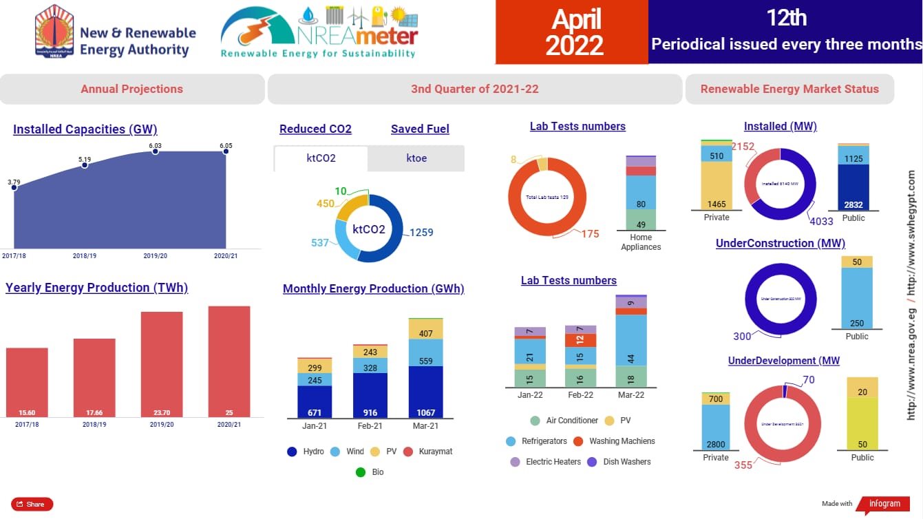 أصدرت هيئة الطاقة المتجددة، نشرتها الدورية الحادية عشر (NREAmeter) متضمنة رصد لأنشطة الطاقة المتجددة خلال الربع الثالث من العام المالي 2021/2022، والتي توضح تقدم الأعمال في مجالات الطاقة المائية، الشمسية، الرياح، والكتلة الإحيائية.