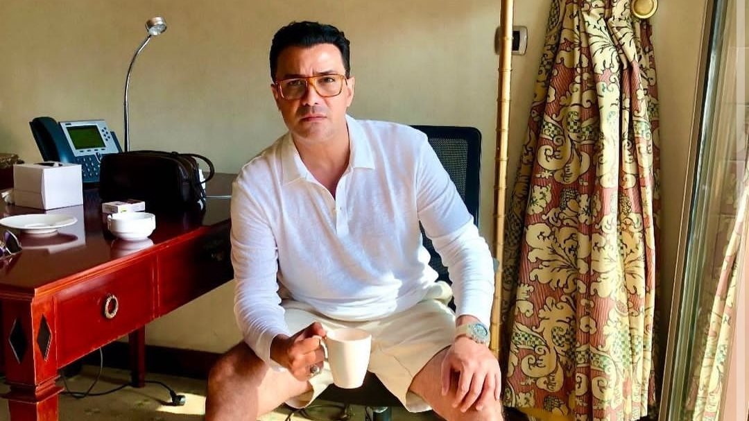 وظهر فيها بإطلاله كاجول داخل مكتبه، مرتدياً شورت بيج وتيشرت أبيض وحذاء من نفس اللون .