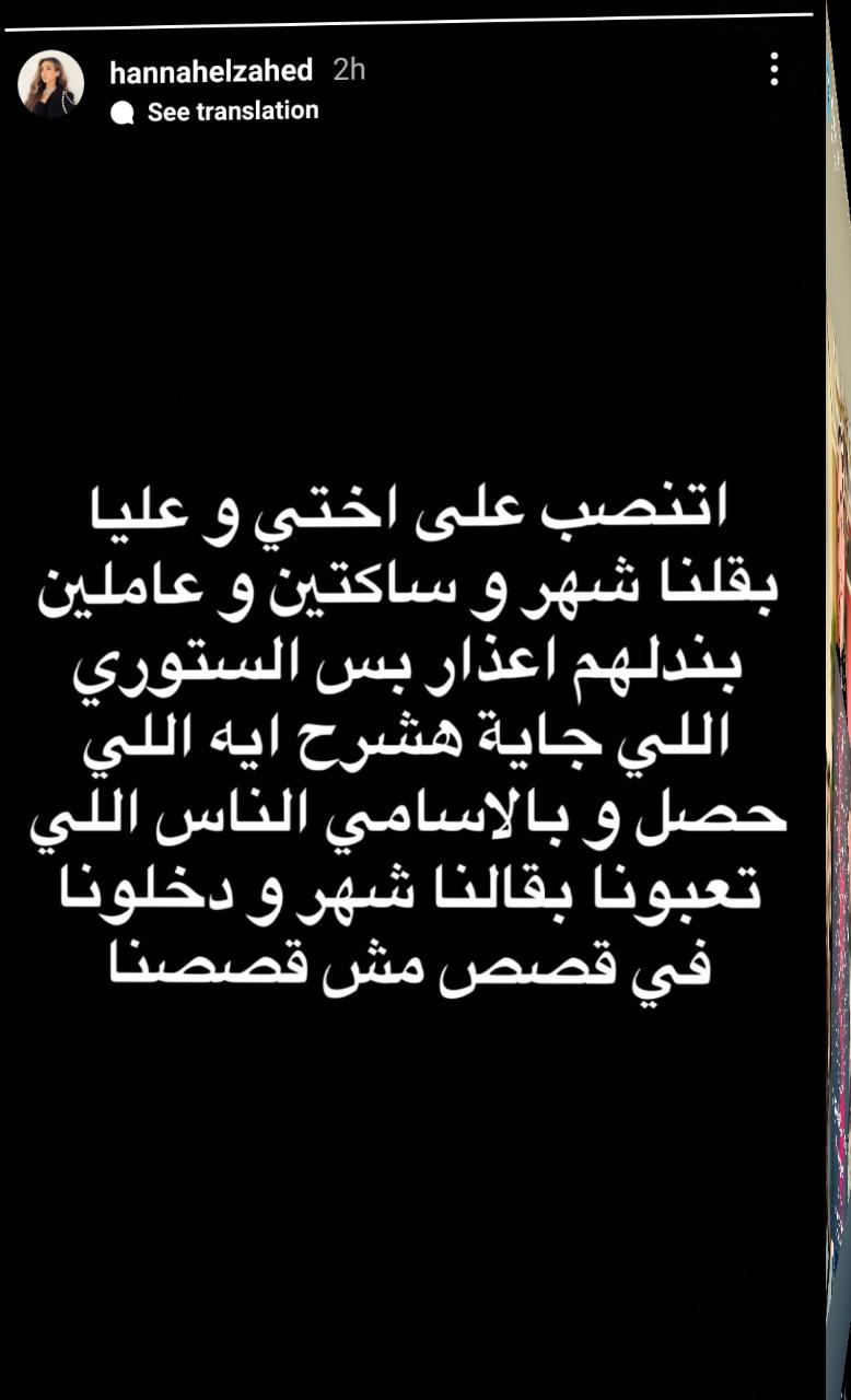 وكتبت هنا الزاهد: “اتنصب على أختي وعليا بقالنا شهر وساكتين وعمالين ندلهم أعذار بس الستوري اللي جاية هشرح ايه اللي حصل وبالاسامي الناس اللي تعبونا بقالنا شهر ودخلونا في قصص مش قصصنا".