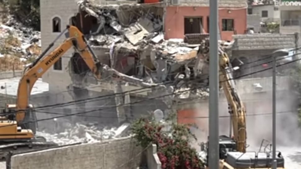 عرضت فضائية يورو نيوز مقطع فيديو يوضح هدم عمارة سكنية لعائلة فلسطينية في بلدة سلوان جنوب القدس الشرقية المحتلة من قبل السلطات الإسرائيلية.
